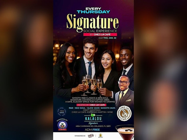 SIGNATURE SOCIAL EXPERIENCE Orlando, this is an invitation to something different.Every Thursday, starting on January 22nd, Chez Lui Café presents a Signature Professional Social Night at Kalalou Signature Restaurant. This is a refined space for professionals, creatives, entrepreneurs, and those building toward their next level; people who value quality conversations and intentional connections. Expect an elegant atmosphere, signature cocktails, premium coffee, and a mature crowd.No loud party energy; just real people, real conversations, and real opportunities. Doors open at 7:30 PM, and we go until 11 PM.Dress well. Come with purpose.Hosted by Chez Lui Café; where people come to sip, share, and connect.