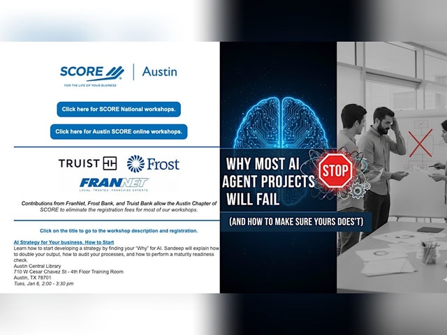 **Enroll here. Limited Seats: https://score.tfaforms.net/112?EventID=a10Vt00000DS41B** [https://score.tfaforms.net/112?EventID=a10Vt00000DS41B**] Double Your Output: A Practical AI Workshop with SCORE- AI Strategy for Your business. How to Start [https://f7btjwgbb.cc.rs6.net/tn.jsp?f=001WnOreyaD51-aXxXgYfnRCjCjztuyRsZlkaxEQmhec-adGaUPFEVFeuEsfPysrMSRi3ELfcGXMDYOHDdUdkKjfZaUckBXxWgW0M7gEoOO0AyebbrrBR2SUJy1pdxWP9cGof2SWcB9xf7-tD6GLfDHMR9VX6vUWuG4Iyln1WOmSl7y4DS3rpIuUxOgCopNNjFTNyiJi3Lu4Nc=&c=IebE6PLnFVtqHxJjgCfds1oLU3q9u89M085B4zdsUqH-3s4u17XxGA==&ch=DT-JIIJseD2xfzZBIdwxcXjsuVmE87Pz-B3c9-f9D7JbLOJjvTo7aA==] Description: Are you ready to stop guessing about AI and start using it to grow your business? Come join us in person for a high-value workshop with Sandeep, a SCORE volunteer and industry expert. This session is focused entirely on strategy and execution. As always with SCORE, this is a volunteer-led event with no sales pitches attached. What we will cover: * The "Why" of AI: Moving past the trends to find real value for your company. * Efficiency Boost: Learn the specific methods to double your team’s output. * Process Auditing: A step-by-step guide to reviewing your current operations. * Maturity Readiness Check: Are you actually ready to deploy? We’ll help you find out. Who should attend? Local entrepreneurs and small and medium business owners who want unbiased, expert guidance on navigating the world of AI.