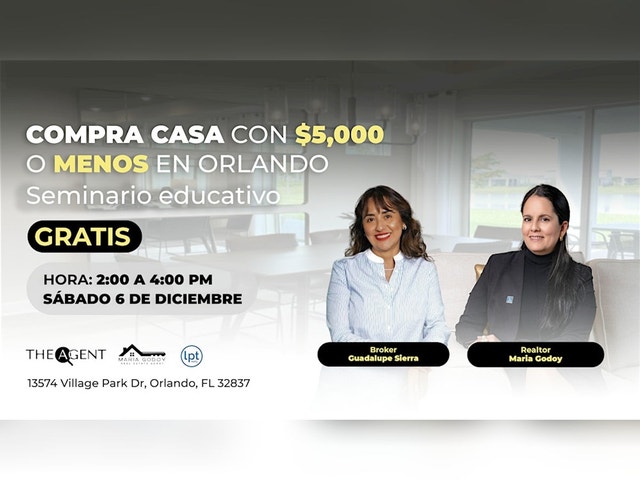 đĄ Compra casa con $5,000 o menos en Orlando âš SerĂĄ totalmente GRATUITO, pero los cupos son limitados⊠¥reserva ahora! Explicaremos paso a paso cĂłmo puedes comprar tu primera propiedad en Orlando con $5,000 o menos de inicial, $0 en gastos de cierre, y quĂ© opciones existen si tienes Permiso de trabajo, incluyendo el menor enganche posible y las mejores tasas de interĂ©s disponibles. Hablaremos de: âąâ â đ§Ÿ CrĂ©ditos hipotecarios que realmente funcionan para primeros compradores. âąâ â đž CĂłmo obtener ayuda del Estado para reducir tu inicial. âąâ â đŠ Programas especiales, asistencia financiera y beneficios que pocos conocen. âąâ â đ Las mejores zonas de Orlando segĂșn tu presupuesto y estilo de vida. Este seminario es educativo estĂĄ diseñado para que entiendas cĂłmo dar tu primer paso hacia la compra de propiedades en 2025. đ Fecha: SĂĄbado, 6 de diciembre â° Hora: 2:00 pm â 4:00 pm đ Lugar: 13574 Village Park Dr, Orlando, FL 32837 âš ÂĄNo dejes pasar esta oportunidad Ășnica! ÂĄTe esperamos!