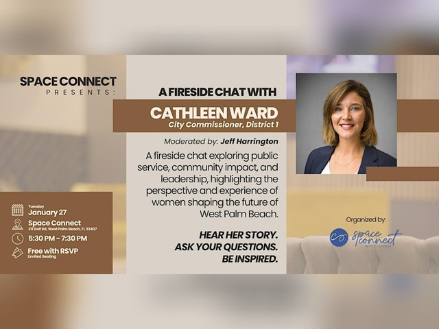 Join us at Space Connect for an engaging fireside chat with West Palm Beach City Commissioner Cathleen Ward (District 1), focused on female leadership, public service, and community impact. In this intimate conversation, Commissioner Ward will share her journey as a woman in leadership, her experience navigating public service and law, and her vision for building a stronger, more inclusive West Palm Beach. Moderated by attorney Jeff Harrington, the discussion will highlight the importance of leadership representation, thoughtful policy-making, and collaboration between government, business, and the community. The evening will conclude with networking in a welcoming and inspiring environment. PERFECT FOR: * Women leaders and aspiring women in leadership * Entrepreneurs and business owners * Community leaders and advocates * Professionals interested in local government and policy * Residents passionate about civic engagement and inclusive leadership WHAT TO EXPECT: * A moderated fireside chat centered on female leadership * Insights from Commissioner Cathleen Ward on policy, governance, and community development * Reflections on navigating leadership as a woman in public service * Meaningful conversation around business growth, housing, and quality of life * Networking with local professionals and engaged residents * Complimentary drinks and inviting community vibes * An inspiring evening at Space Connect, West Palm Beach’s hub for conversation, connection, and innovation. EVENT DETAILS Date: Tuesday, January 27 Time: 5:30 PM – 7:30 PM Location: Space Connect 311 Golf Road, West Palm Beach, FL 33407 🎟️ Free with RSVP — Limited seating available