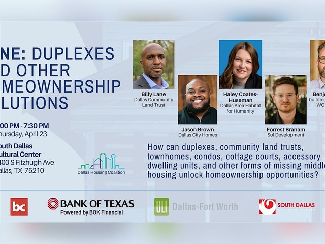Join us to hear from diverse stakeholders in Dallas' housing landscape, brought to you by buildingcommunityWORKSHOP [https://www.bcworkshop.org/] and Dallas Housing Coalition [https://www.dallashousingcoalition.com/]. Over the last 20 years, [bc] has initiated built works and dialogue around community-based housing to explore how diverse housing types can be used as a tool for affordable homeownership. Examples include their 2024 [https://www.bcworkshop.org/one-housing-report?rq=%2Bone] +ONE Report and "missing middle housing" models such as cottage courts [https://www.bcworkshop.org/the-cottages-at-hickory-crossing] and duplexes [https://www.bcworkshop.org/congo-street-duplex]. [bc]’s most recent report explores how the Duplex model can unlock affordable homeownership After his presentation, [bc] Executive Director Benje Feehan will moderate a panel featuring: Jason Brown, President of Dallas City Homes [https://dallascityhomes.org/]; Billy Lane, Board Member of the Dallas Community Land Trust [https://dallasclt.org/] and Executive Director of Intercity CDC [https://www.icdc.biz/]; Haley Coates-Huseman, Chief Real Estate Office at Dallas Area Habitat for Humanity [https://dallasareahabitat.org/]; and Forrest Branam, CEO of Sol Development. Thank you to our partners for promoting this event: * Bank of Texas [https://www.bankoftexas.com/] * South Dallas Cultural Center [https://sdcc.dallasculture.org/] * Urban Land Institute Dallas-Fort Worth [https://dallas-fortworth.uli.org/]