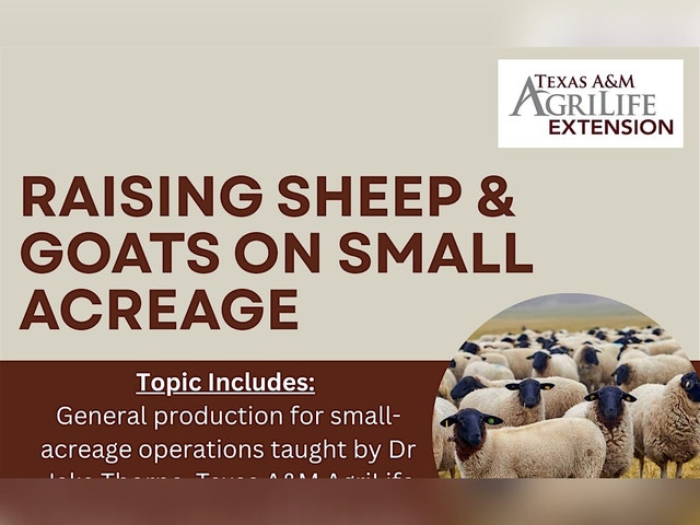 Learn sheep and goat production for small-acreage operations with expert Dr. Jake Thorne General production for small-acreage operations taught by Dr Jake Thorne, Texas A&M AgriLife Sheep and Goat Specialist.