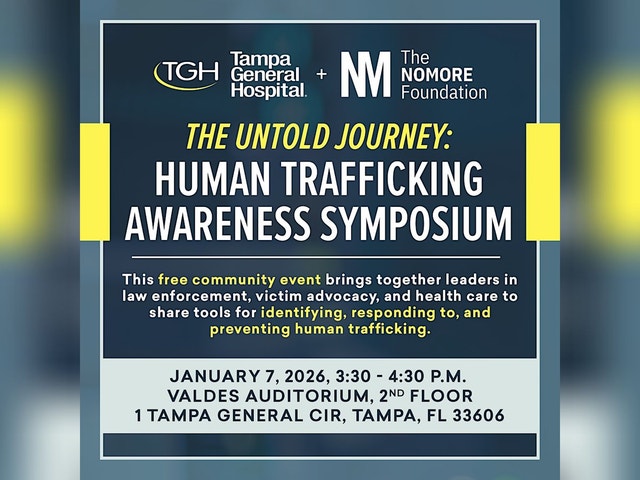 Valdes Auditorium, 2nd Floor at Tampa General Hospital Doors open at 3:00pm Tampa General Hospital (TGH), a leading academic health system and the first hospital in Florida to join Attorney General's 100 Percent Club, will host a Human Trafficking Awareness Symposium aimed at equipping healthcare professionals and community leaders with the tools to identify, respond to, and prevent human trafficking. The symposium will bring together experts in law enforcement, victim advocacy, and healthcare to include: Hillsborough County Sheriff, Chad Chronister; Kim Figueroa, Law Enforcement Expert and Victim Advocate; Connie A. Rose M.S. Ad. Ed., Founder & President, Victims2Survivors-US, Chair of the Hillsborough County Commission on Human Trafficking, and Lived-Experience Advocate; Corporal Alan Wilkett, Retired Former Law Enforcement and Advocate for Legislative Change; Tony Venezia, Vice President of Public Safety Tampa General Hospital/FHSC; and Tami Kent, Co-Founder and Executive Director of The No More Foundation. Together they will share strategies, case studies, and resources for combating this pervasive crime. Local anti-human trafficking partner organizations will also be present to give attendees the opportunity to learn more about the many different ways that they can get involved in anti-human trafficking work in the Tampa Bay Area through education, prevention, intervention, and restorative efforts. According to the U.S. Department of State, an estimated 27.6 million people worldwide are victims of human trafficking at any given time, and Florida ranks among the top states for reported cases. Human trafficking is an issue close to home and everyone has a part to play in combating this issue and protecting our community.