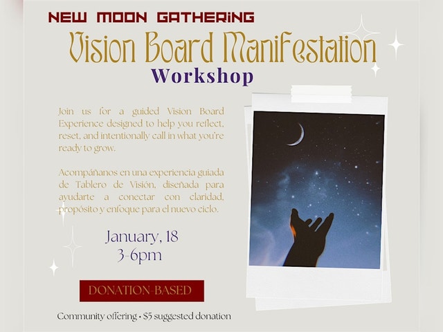 NEW MOON - VISION BOARD MANIFESTATION WORKSHOP Ready to set your intentions and manifest your dreams? Join us in person for the New Moon Vision Board Manifestation Workshop! This fun and creative session is all about harnessing the fresh energy of the new moon to bring your goals to life. Bring your ideas, your vibe, and let's craft your vision board together. See you there for some manifesting magic! ¿Listos para definir tus intenciones y manifestar tus sueños? ¡Únete a nosotros en persona para el Taller de Creación de Tableros de Visión con la Luna Nueva! En esta sesión divertida y creativa, aprovecharemos la energía renovadora de la luna nueva para hacer realidad tus metas. Trae tus ideas, tu buena energía y crearemos juntas tu tablero de visión. ¡Te esperamos para vivir la magia de la manifestación!