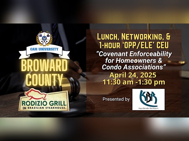 Join us for a fabulous lunch and hear from Kaye, Bender, Rembaum as they present a 1-hour "OPP/ELE" CEU called "Covenant Enforceability for Homeowners & Condo Associations ." Get your CEU, network with great business partners, and have an amazing lunch! 11:30 am - 1:30 pm