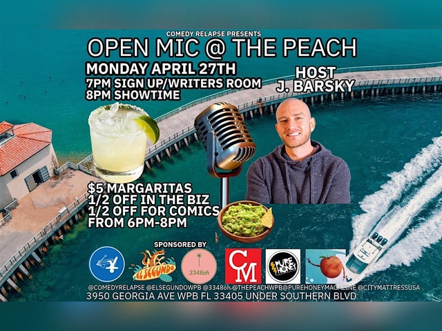 ENJOY ONE OF THE BEST OPEN MICS IN SOUTH FLORIDA.COME WATCH SOME OF THE FUNNIEST COMICS FOR FREE. MOST COMICS AT THE PEACH HAVE YEARS OF EXPERIENCE OR ARE JUST STARTING OUT. MOST OF THE COMICS ARE LOCAL BUT COMICS FROM ALL OVER THE WORLD HAVE POPPED IN TO TRY OUT NEW MATERIAL. ANYONE IS WELCOME TO PARTICIPATE IN THE OPEN MIC. COMICS GET A 5MIN SET AND ARE LIGHTED WHEN THEY HAVE ONE MINUTE LEFT. 7PM IS A WRITERS ROOM FOR COMICS AND AUDIENCE. THE WRITERS ROOM IS A WAY FOR COMICS TO TEST A FEW JOKES THEY HAVE NEVER TRIED OR ARE WORKING ON. THE AUDIENCE AND FELLOW COMEDIANS ARE ENCOURAGED TO ENGAGE WITH THE THE COMICS AND GIVE THEM FEEDBACK. THE SHOW STARTS AT 8PM EARLY SIGN UP AT COMEDYRELAPSE.COM