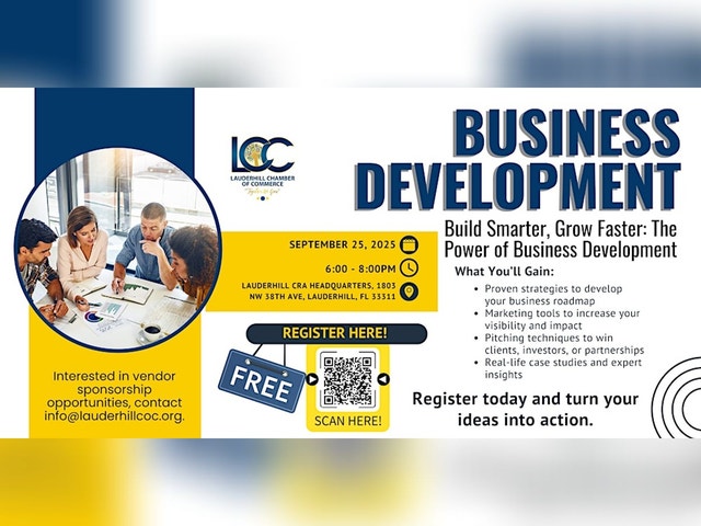 Business Development: Build Smarter, Grow Faster Event Description: Join us for an impactful evening of learning and networking at Business Development: Build Smarter, Grow Faster! Discover the power of strategic growth through proven techniques and insights designed to elevate your business. Whether you're a startup founder, entrepreneur, or small business owner, this event will equip you with practical tools and strategies for success. What You’ll Gain: ✅ Proven strategies to develop your business roadmap ✅ Marketing tools to increase your visibility and impact ✅ Pitching techniques to win clients, investors, or partnerships ✅ Real-life case studies and expert insights Event Details: 📅 Date: September 25, 2025 🕕 Time: 6:00 PM – 8:00 PM 📍 Location: Lauderhill CRA Headquarters, 1803 NW 38th Ave, Lauderhill, FL 33311 Cost: FREE ✨ Don't miss this opportunity to network, learn, and take your business to the next level. 📢 Register now and turn your ideas into action! Interested in vendor sponsorship?Contact us at: info@lauderhillcoc.org