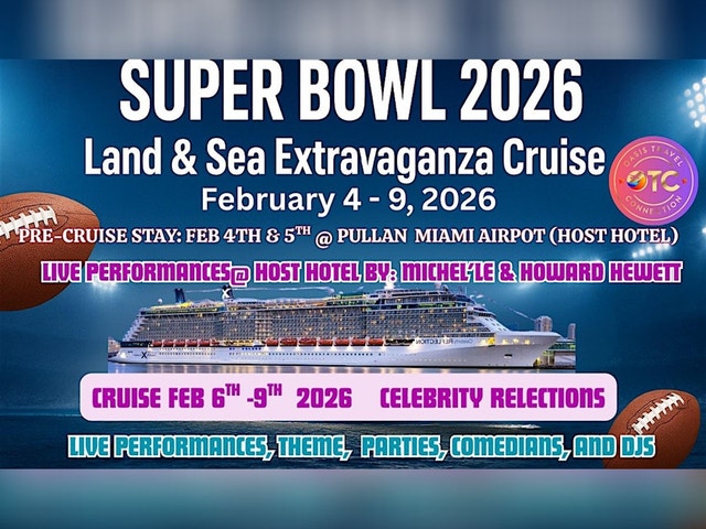 Get ready for the 3rd Annual Super Bowl Land & Sea Cruise, presented by Oasis Travel Connection! This exclusive getaway kicks off with two exciting nights in Miami (Feb 4β5) at the Pullman Miami Airport Hotel β with live performances, themed parties, and special events. Then, on Feb 6β9, set sail aboard the Celebrity Reflection for a 3-night cruise filled with music, comedy, dancing, and the Ultimate Super Bowl watch party at sea! ______________________________________________________________________________________________________ π€ ENTERTAINMENT LINEUP β¨ Live Performances β Michelβle, Howard Hewett & Public Announcement π Comedy Shows β Steve Brown & Screw Roy Rice πΆ Nonstop Music & Dancing β DJ LaRose Royce, Brad Rush, Ted TP3, and Line Dance Instructor Bowtie Bugsy π Super Bowl at Sea β Watch the big game in style with fans, fun, and ocean views This is more than a cruise β itβs the Ultimate VIP Land & Sea Celebration, where memories are made, and the party never stops! _____________________________________________________________________________________________________ π¨ HOTEL PACKAGES β PULLMAN MIAMI AIRPORT (OTC SPECIAL RATE) Stay in style before the cruise and enjoy VIP perks at our exclusive Oasis Travel Connection group rate. Includes: βοΈ Pullman Miami Airport Hotel (1 or 2 nights β OTC special rate) βοΈ Free Airport Shuttle (to/from Miami International Airport) βοΈ One-way transportation to Port Everglades (Ft. Lauderdale) for cruise βοΈ Super Bowl T-shirt & Special Gift Bag βοΈ Gratuities Rates (per person): Single Occupancy (1 guest per room) * 1 Night β $293 * 2 Nights β $533 Double Occupancy (2 guests per room) * 1 Night β $173 per guest ($345 total for 2) * 2 Nights β $293 per guest ($585 total for 2) π To book Hotel Packages, contact Arvella Nelson at (951) 334-6204 or email arvella@oasistravelconnection.com, or Book Now [https://www.cognitoforms.com/OasisTravelConnection/RegistrationForm2026] ______________________________________________________________________________________________________ π’ CRUISE SPOTLIGHT β CELEBRITY REFLECTION (FEB 6β9, 2026) Your Super Bowl weekend continues on the Celebrity Reflection, a 3-night luxury cruise with all-inclusive perks: Deposit: $100 per person required to secure your spot. Ports of Call: β Key West, Florida ποΈ Bimini, Bahamas βοΈ Cruise Fare βοΈ Classic Drink Package βοΈ Basic Wi-Fi βοΈ Port Fees & Taxes Rates from $455 pp (dbl occ..) β Limited Availability π To book Hotel Packages, contact Arvella Nelson at (951) 334-6204 or email arvella@oasistravelconnection.com or Book Now [https://www.cognitoforms.com/OasisTravelConnection/RegistrationForm2026] _____________________________________________________________________________________________________ π W-HOTS ENTERTAINMENT PACKAGE β $241.65 (INCLUDES $16.65 EVENTBRITE FEE) Upgrade your trip with the exclusive VIP Party Pass, managed exclusively for OTC guests Limited tickets available at this rate β Full access to all entertainment events β both in Miami and onboard the ship. Live at Pullman Hotel: β Michelβle, Howard Hewett & Public Announcement Special Live Performance at Sea: π€ Public Announcement π More Onboard Fun: * Comedy shows: Steve Brown & Screw Roy Rice * DJs: LaRose Royce, Brad Rush, Ted TP3 * Southern Soul Line Dancing: Bowtie Bugsy * Super Bowl at Sea Watch Party β οΈ Important Notice: The cruise must be booked through Oasis Travel Connection β Arvella Nelson Group. If your cruise is booked outside of this group, do not purchase this package β your payment will be refunded. π Pay directly here on Eventbrite [https://www.eventbrite.com/e/2026-w-hots-sweet-16th-annual-land-sea-party-super-bowl-sea-tickets-1414778814519?aff=oddtdtcreator]