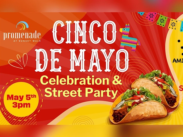 PROMENADE AT SUNSET WALK PRESENTS THE 6TH ANNUAL "CINCO DE MAYO" STREET PARTY AND CELEBRATION! Non-Stop Live Music Celebration with "The Rundown" including a Tribute to Mexican Pop - Rock Stars "Maná" & The Debut of Latin/Urbano Band -"Fire Rhythms" Live on 2 - Performance Stages in The Plaza & South of the Border Roundabout... "DJ Gabriel" & "DJ Leony" spinning the very best Mariachi, Latin Pop, Merengue , Salsa, Bachata & More! Plus, Artisan Market and Street Performers including "The Tres Amigos!" JOIN OUR "CINCO DE MAYO TACO TUESDAY SCAVENGER HUNT"! 5PM TO 7:30PM. HERE'S HOW IT WORKS: * Pick Up a "Taco Tuesday Scavenger Hunt" Clue Card * Find the Tacos hidden throughout the Promenade * Get a "Taco Surprise" Gift for finishing! Enjoy Food & Beverage Specials at Participating Venues! NO Outside Food & Beverage or Coolers Join Us for Cinco de Mayo!! Over 30 Restaurants, Specialty Shops, & Experiences FREE Admission & Parking Always Pet Friendly Rain or Shine NOTICE: ONLY TICKETS PURCHASED THROUGH THE EVENTBRITE PLATFORM WILL BE HONORED. THERE ARE NO AUTHORIZED THIRD PARTY TICKETING PLATFORMS.