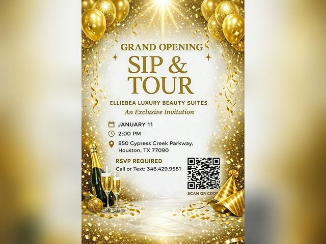 JOIN US FOR THE SIP & TOUR ELLIEBEA LUXURY SUITES GRAND OPENING! Come hang out in person and explore the stunning new Elliebea Luxury Suites. Enjoy a relaxed vibe as you sip on your favorite drinks while checking out the elegant spaces and all the cool features. It’s the perfect chance to unwind, meet new people, and soak in the luxury atmosphere. Don’t miss this exciting grand opening celebration!