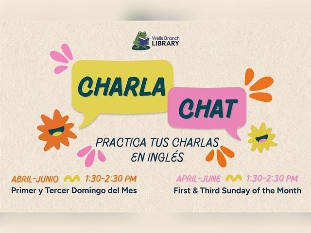 CHARLA CHAT - PRACTICE YOUR ENGLISH WITH CHATTING Join us at the Wells Branch Community Library to practice your English conversational skills. This is an opportunity to practice your fluidity and gain confidence in speaking English as a second language. English speakers are welcome as well. THIS IS AN ADULT PROGRAM. TEENS MUST BE ACCOMPANIED BY AN ADULT. CHARLA CHAT - PRACTICA TUS CHARLAS EN INGLES ¡Únete a nosotros en la Biblioteca de la Communidad de Wells Branch para practicar tus habilidades de conversación en inglés! Es una oportunidad relajada para mejorar tu fluidez y ganar confianza hablando. CHARLA CHAT ES UN PROGRAMA PARA ADULTOS. LOS JÓVENES DEBEN ESTAR ACOMPAÑADOS CON UN ADULTO.
