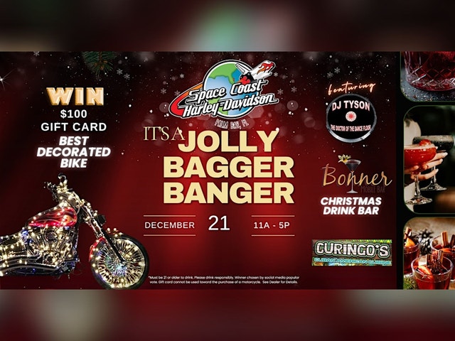 GET READY FOR THE JOLLY BAGGER BANGER! Join us at Space Coast Harley-Davidson on Sunday, December 21, from 11a - 5p. It's a Jolly Bagger Banger! Best decorated bike wins $100 gift card, by popular vote! DJ Tyson will be spinnin' the jamz, Bonner Mobile Bar will have a special Christmas Cocktail menu and Curingo's Food Truck will curb your hunger. Get in the festive spirit and come hang with us! *Must be 21 or older to drink. Please drink responsibly.