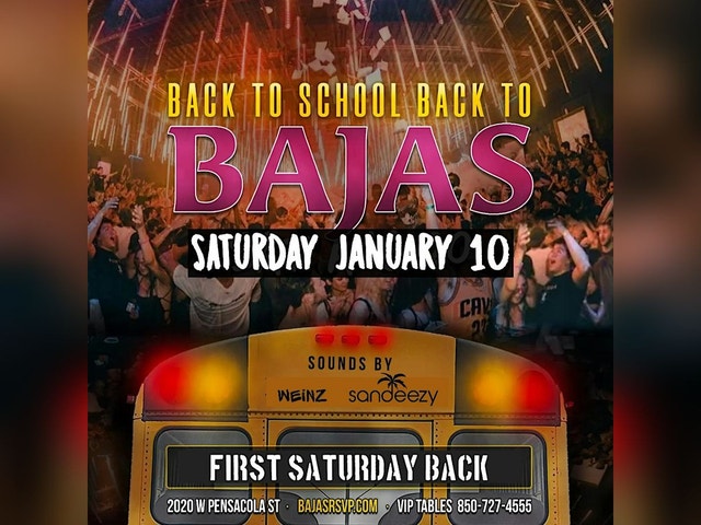Back to School Back to Bajas! First Saturday Back! 🎉🍾👯♀️ RSVP For Free / Reduced Entry before spots fill up! 🍹Ladies Drink Free 10-11🍹 🚌FREE Shuttle Service from FSU Landis🚌 (Pre-banding at Bajas Saturday Jan 10th 4-6pm) Music by Sandeezy & Weinz 🍾 VIP Table Reservations (850)727-4555🍾 (18 to Party - 21 To Drink)