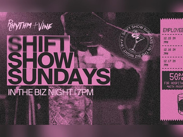SHIFT SHOW SUNDAYS AT RHYTHM & VINE EVERY SUNDAY| 7PM-CLOSE Welcome To Fort Lauderdale's Biggest ITB Party Every Sunday! Featuring: * 50% Off The Entire Tab For In The Biz Employees *with proof of employment * Food Truck Grub *RSVP To Receive The Complimentary Shot Of The Day! +21 954-868-4351 401 NE 5th Terrace, Fort Lauderdale, FL 33301 @Rhythm_Vine | www.Rhythm-Vine.com