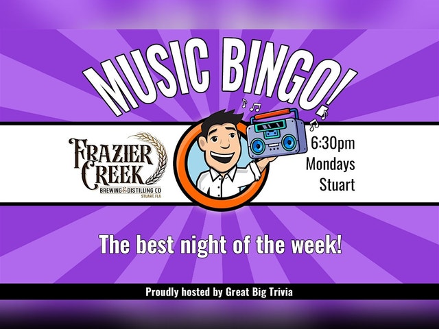 ABOUT MUSIC BINGO AT FRAZIER CREEK Mondays Just Got a Whole Lot More Musical at Frazier Creek! 🎶🍻 Looking to beat the Monday blues? Join Great Big Trivia at Frazier Creek Brewing & Distilling Co. for a high-energy night of Music Bingo! Starting at 6:30 PM, we’re turning up the volume in Stuart’s favorite "Brewstillery" for a game that’s all about the hits and none of the stress. What is Music Bingo? It’s the classic game you love, but with a rhythmic twist! Instead of listening for numbers, you’ll listen to clips of your favorite songs—from The Doors to Dua Lipa, and The Temptations to Taylor Swift. When you hear a song that’s on your card, mark it off! No Music Trivia Knowledge Required! Don’t worry if you aren’t a walking music encyclopedia. We reveal the song titles with every clip, so whether you're a casual listener or a total music buff, everyone has an equal shot at winning. It’s not a cutthroat competition—it’s a social, sing-along celebration! Why You Should Be There: • It’s FREE to play! • Prizes for the winners of every round. • The Venue: Enjoy the award-winning atmosphere of Frazier Creek (voted USA Today’s Best New Brewery in the US!). Sip on their world-class craft beers, spirits, cocktails, or hard ciders while you play. Gather your friends, grab a drink in their large taproom, and get ready to sing, drink, and win. We’ll see you this Monday at 6:30 PM!