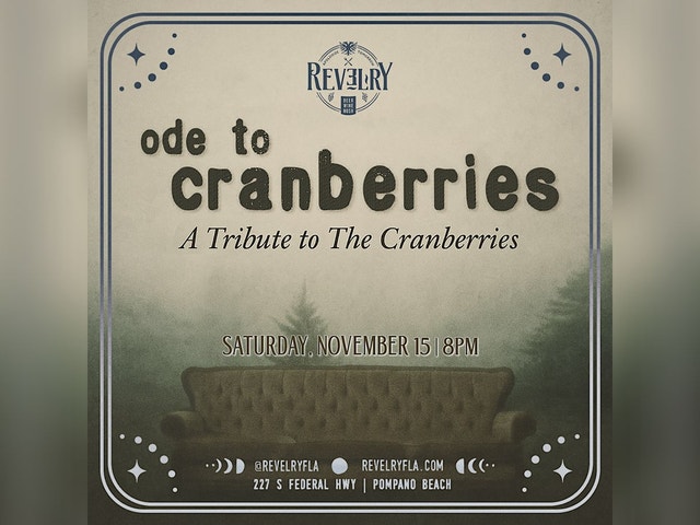 Ode to The Cranberries: A Night of Tribute at Revelry 📅 Date: Saturday, November 15, 2025 🕗 Time: 8:00 PM 📍 Location: Revelry, 227 S. Federal Hwy, Pompano Beach, FL 33062 🎟️ FREE Event | RSVP Strongly Encouraged!🌐 Website: www.revelryfla.com [http://www.revelryfla.com] Join us for a heartfelt night of music as Revelry presents Ode to The Cranberries — a special tribute event celebrating the hauntingly beautiful sounds of one of the most iconic alternative rock bands of the 90s. On Saturday, November 15, 2025, starting at 8 PM, experience an evening dedicated to the voice and spirit of Dolores O’Riordan and the timeless music of The Cranberries. Looking for live music near me or something unforgettable to do in Pompano Beach? This free event at Revelry is the perfect way to kick off your summer weekend! Come enjoy a night of nostalgia, emotional melodies, and passionate performances that honor the beloved songs that touched millions around the world. WHAT TO EXPECT AT ODE TO THE CRANBERRIES 🎶 Authentic Live Performance: Our talented musicians will bring The Cranberries' legendary catalog to life with authentic renditions of favorites like Linger, Dreams, Zombie, Ode to My Family, and many more. Whether you’re a lifelong fan or discovering their magic for the first time, this tribute promises to hit every emotional note. 🎤 A Beautiful Atmosphere: Revelry’s cozy vintage lounge, often described as a hidden gem, sets the perfect scene for an intimate live music event. With our speakeasy feel, eclectic décor, and warm energy, you'll feel like you're witnessing a private concert among friends. 🍸 Craft Cocktails and Elevated Eats: Sip on expertly crafted cocktails and savor delicious dishes from our kitchen while you lose yourself in the music. Whether you’re trying one of our specialty drinks or indulging in a full meal, Revelry’s menu complements every moment. 🎟️ Free to Attend, RSVP Encouraged: Although this is a free event, space is limited! RSVP now to secure your spot and enjoy a night dedicated to one of the most cherished bands of a generation.