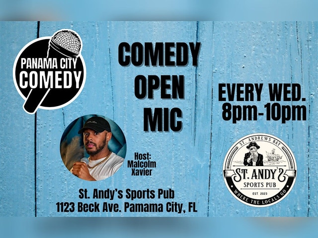 Comedy Open Mic at St. Andy's Sports Pub. Open to all experience levels. Hosted by Malcolm Xavier. Sign up in person at 7:30pm. Free to attend. TICKETS for our SHOWS are available at panamacitycomedy.com [https://www.panamacitycomedy.com]