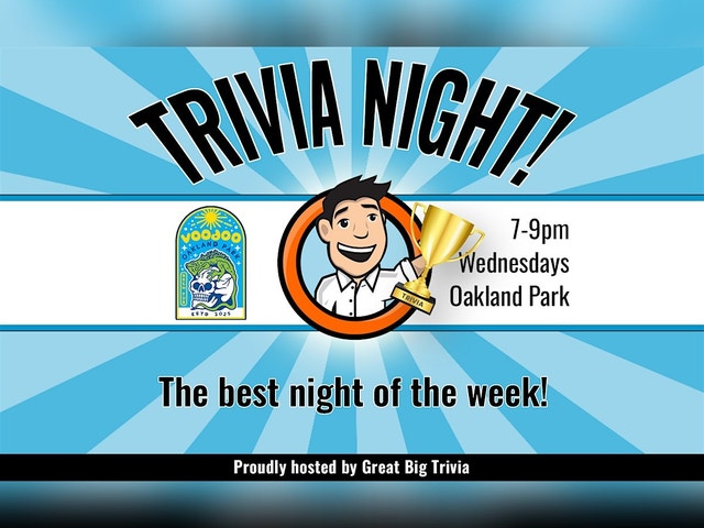 IT'S TIME FOR TRIVIA! Get ready to put your knowledge to the test, Oakland Park! Great Big Trivia is excited to host weekly trivia at Voodoo Brewing Co. in Oakland Park, FL, every Wednesday from 7-9 PM! Gather your smartest friends, form a team, and dive into a night of challenging and fun questions spanning everything from pop culture and history to science and sports. Our professional DJ host will lead the way, ensuring a lively, engaging, and family-friendly atmosphere where every correct answer brings you closer to victory and awesome prizes. It's the perfect mid-week escape to unwind, strategize with your crew, and enjoy Voodoo Brewing Co.'s fantastic selection of brews and delicious food. Make Wednesdays your new go-to for competitive fun and brain-teasing excitement!