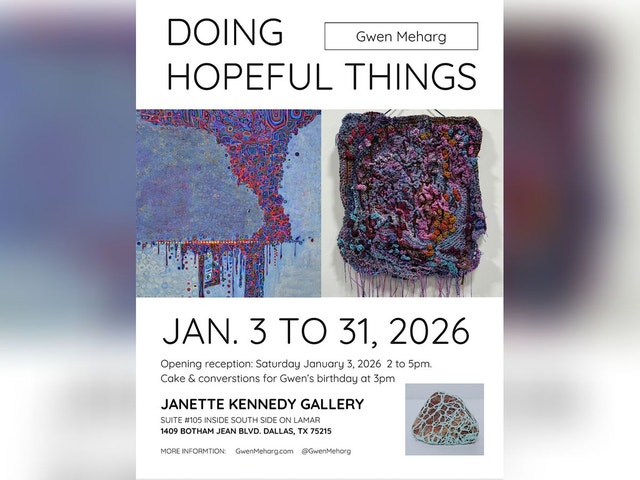 A colorful, immersive art exhibition by Gwen Meharg at Janette Kennedy Gallery Doing Hopeful Things is a colorful, immersive exhibition by artist Gwen Meharg, opening at Janette Kennedy Gallery.