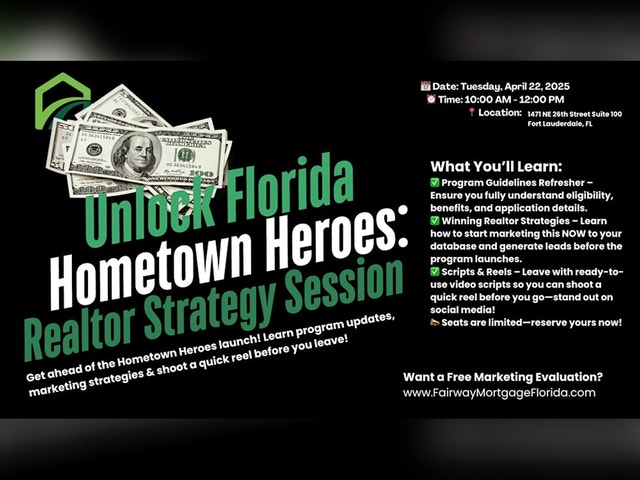 📅 Date: Tuesday, April 22, 2025 ⏰ Time: 10:00 AM - 12:00 PM 📍 Location: [Insert Venue Name or Zoom Link] 💰 $100M in Funding—Gone in 60 Days! Are Your Clients Ready? Florida’s Hometown Heroes Program is back on July 1 with a massive $100M in funding, but history tells us these funds won’t last long—typically gone within two months! If you're a Florida realtor, this is your chance to get ahead of the competition and position your clients for success. WHAT YOU’LL LEARN: ✅ Program Guidelines Refresher – Ensure you fully understand eligibility, benefits, and application details. ✅ Winning Realtor Strategies – Learn how to start marketing this NOW to your database and generate leads before the program launches. ✅ Scripts & Reels – Leave with ready-to-use video scripts so you can shoot a quick reel before you go—stand out on social media! 📣 Seats are limited—reserve yours now!