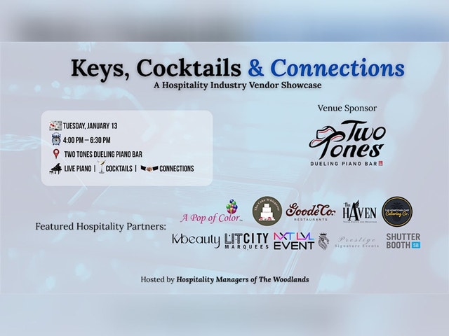 JOIN US FOR KEYS, COCKTAILS & CONNECTIONS! Join us for an energetic and engaging evening designed exclusively for hospitality and event industry professionals! Keys, Cocktails & Connections is a curated Hospitality Managers Of The Woodlands vendor showcase bringing together top-tier hospitality vendors, venues, and industry decision-makers in a fun, high-vibe environment. Set inside the lively atmosphere of Two Tones Dueling Pianos, this event blends networking with entertainment—because business is better when it doesn’t feel like work. ✨ WHAT TO EXPECT: * 🎹 Live dueling piano ambiance * 🍸 Cocktails & light bites * 🤝 Intentional networking with hospitality leaders * 🏨 Showcase tables featuring trusted industry vendors * 💬 Meaningful conversations + real connections Whether you’re a vendor looking to get in front of hospitality decision-makers or a manager sourcing new partners, this event is designed to spark relationships that turn into referrals, collaborations, and long-term partnerships. 🎯 WHO SHOULD ATTEND: * Hotel & restaurant managers * Venue sales & operations teams * Event planners & producers * Hospitality vendors & service providers Space is limited to keep the experience high-quality and conversational—early registration is encouraged.