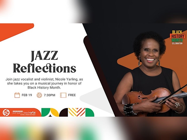 Presented in partnership with Gold Coast Jazz Society: Jazz Reflections featuring Nicole Yarling We'll be hosting stellar jazz vocalist and violinist Nicole Yarling along with members of the Gold Coast Jazz Society Band. This free concert is presented by the Gold Coast Jazz Society, in honor of Black History Month. Yarling is a violinist, singer and teacher born in Brooklyn, New York, to a musical family in which her father played jazz organ and piano. Aside from the familial influences, Nicole's education is extensive, ranging from a B.A. in music from Baruch College to a master’s in music education at Columbia University, as well as private training in composition, arranging, voice and violin. She was “discovered” by the iconic singer Joe Williams, and she worked with him on her 1998 album Joe Williams Presents Nicole Yarling at the Manchester Craftsmen's Guild, which was to be his last recording before his death. Yarling has also collaborated with Dizzy Gillespie, KC & The Sunshine Band and Albert Lee, and was a featured soloist for three years on tour with Jimmy Buffet. She also participated on Buffet's platinum-selling album, Fruit Cakes, and then went on to do eight worldwide tours with her own project, Little Nicky and the Slicks. The Gold Coast Jazz Society has been a major presenter of jazz concerts, jazz education, and jazz outreach programs in Broward County since 1992. The mission of the organization is to perpetuate and advance the cultural art form of jazz through performances, education, and outreach activities.