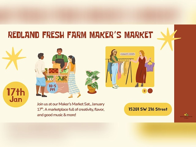 Redland Fresh Farm: Maker's Market! Join us at our Maker's Market on Saturday, January 17, 2026 at 10:00 AM. A marketplace full of creativity, flavor, good music, and more! We'll have unique vendors, fresh produce, delicious treats, and fun activities for all. Saturday 1/17/26 @ 10:00 AM - 5:00 PM 15201 SW 216 Street, Miami, FL, 33170 For vending opportunities please call us at 305-845-9805 email us at info@redlandahead.net!