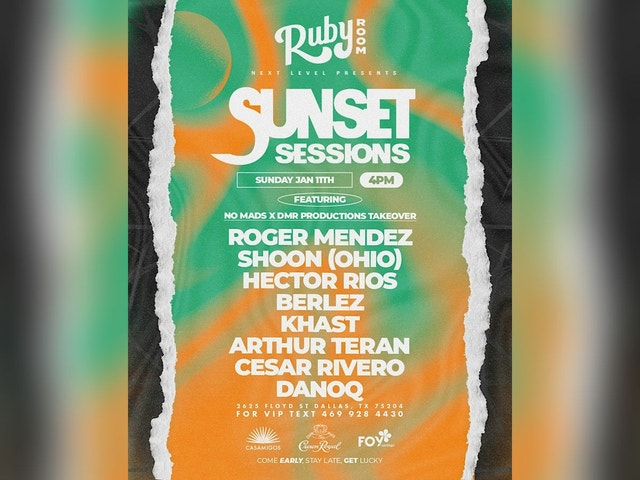 Join us at Ruby Room for a Special Rooftop Sunset Event Every Sunday with Rotaing House Music DJs Ruby Room is Located on the Rooftop Lounge at Green Light Social This is a FREE Show with a RSVP Ticket 21+ Food & Drinks Available VIP Tables Contact 469-928-4430 *All Year long, Rain or Shine Every Sunday* F ollow Sunset Sessions on Instagram [https://www.instagram.com/sunset_sessionsdtx/]