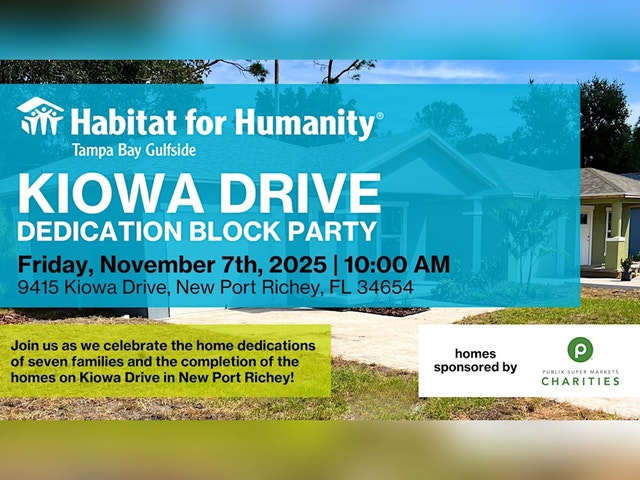 This celebration marks the completion of the seven homes being built on Kiowa Drive in New Port Richey. Thank you to Publix Super Markets Charities for sponsoring these homes. Home Dedications are held at the finished home of a Habitat Homeownership Partner. When a new homeowner opens the front door of their new safe and affordable home for the first time, it symbolizes breaking the cycle of generational poverty. Join us to learn about the impact of the Habitat for Humanity program and how you can get involved. The following families will be earning the keys to their forever homes: The Rodrigues/Hart Family The Seija Family The Mcleod Family The Fisher Family The Wiggins Family The Dorsey Family The Blackshear Family The dedications will also be broadcast live: https://www.facebook.com/HabitatTampaBayGulfside/live/ [https://www.facebook.com/HabitatTampaBayGulfside/live/?__cft__[0]=AZURqDjI8xWLljngL1hXXPD0dz1o3BFFbx0ev4p-kUtrmBIw7TBnZ2VwQi1Cg5CUsGsttEC6lo-Ye9psn-v-FglSfsDk-57vjyW0RPf_vvtHaw&__tn__=q] For more information on these Habitat families, please visit our Homeowner Stories blog at: https://habitattbg.org/news/homeowner-stories/ [https://habitattbg.org/news/homeowner-stories/?fbclid=IwZXh0bgNhZW0CMTAAYnJpZBExMjIzcUtwenpvYjJIWUJtUQEeh2osKVpEk3q-3Wt26Xkm3NHQl8ZAjjHQMkeRoFSZAAu96Y6AFf_bcPlGqkQ_aem_Z-RGh3j1GHp-tEsKHBD-BA]