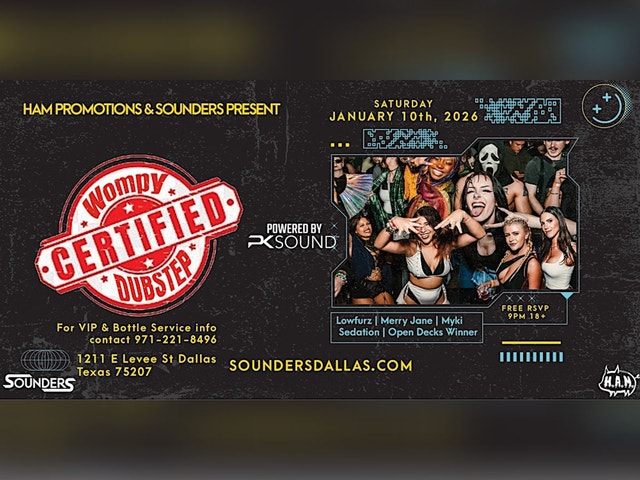🔊🔥 CERTIFIED DUBSTEP @ SOUNDERS 🔥🔊 SATURDAY, JANUARY 10TH | 9PM–2AM PROPER DUBSTEP • 140 • REAL BASS MUSIC 📍 Location: Sounders (1211 E Levee St) 🆔 Ages: 18+ ($10 Minor Fee Under 21) 🔊 PK Sound: Dallas’ BEST sound system 💣 FOR THE REAL DUBSTEP HEADS This one’s for the people who know; deep subs, heavy grooves, real weight. Certified Dubstep is a night dedicated to proper dubstep and 140 BPM bass music — the kind you get down to, head-nod to, and feel in your chest from the first tune to the last. No fluff. No genre hopping.Just damn good dubstep all night long. 🔊 WHAT TO EXPECT -Proper dubstep + 140 from open to close -Deep, weighty basslines and sound system music -DJs focused on groove, flow, and selection -PK Sound delivering clean subs and body-moving low end -A flow-friendly, heads-down dancefloor -Drink specials all night -On-site parking available If you love dubstep the way it was meant to be played — this is your night. THE VIBES Dark, heavy and intentional; Certified Dubstep is about letting the music breathe and the bass do the talking. Come to dance.Come to skank.Come to feel the low end the way it’s supposed to hit. 🍾 VIP TABLES AVAILABLE Upgrade your night without losing the vibe.📩 Email: VIP@soundersdallas.com 🚗 PARKING On-site parking available + nearby street parking⚠️ Please follow posted signs and do not leave valuables in vehicles FAQ & GUIDELINES -18+ with valid government-issued ID -21+ to consume alcohol -If you’re sick or feeling unwell, please stay home 🎟 FREE RSVP — SATURDAY, JANUARY 10TH No trends. No gimmicks.Just Certified Dubstep at Sounders. Lock in your free RSVP and meet us in the low end.