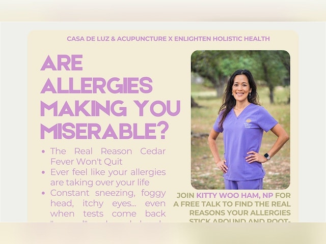 * The Real Reason Cedar Fever Won't Quit * Ever feel like your allergies are taking over your life * Constant sneezing, foggy head, itchy eyes... even when tests come back "normal" and meds barely take the edge off? Perfect for anyone frustrated with allergies impacting energy, sleep, or daily life. Join Kitty Woo Ham, Functional Medicine NP for a free talk during lunch to find the real reasons your allergies stick around and root-cause steps that finally give you relief – without just popping more pills. Grab lunch and lets talk. LIMITED seats – Bring a friend! Following the talk, you’ll have an option to book a 15-minute discovery call for personalized next step
