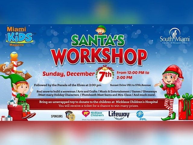 Join us at our family tradition, " Santa's Workshop" celebration. We will have the following: Arts and Crafts Music & Entertainment Games Giveaways Meet many Holiday Characters Photobooth Meet Santa and Mrs. Claus And, much more! Don't miss the visit from Santa and Mrs. Claus closing the parade. Santa's Parade of the Elves will follow at 2:00 p.m. Bring a new unwrapped toy to donate to the children at Nicklaus Children’s Hospital. You will receive a ticket for a chance to win special prizes! Thank you to our sponsors, South Miami Police Department, Nicklaus Children’s Hospital, Lifeway, and FPL who will be on site. Click HERE [https://youtu.be/H3AaPM2N4As?si=xAxnShCkatku8odk]to view our previous Santa's Workshop and Parade of the Elves! If you RSVP or enter the areas where the event will take place, you are consenting to have your pictures and videos possibly taken to be used for the magazine promotional purposes. Contact miamikidsmagazine@gmail.com for any questions or concerns.