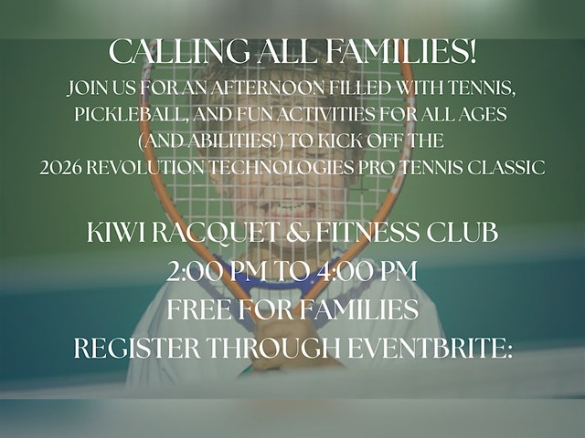 CALLING ALL FAMILIES! Join us for an afternoon at Kiwi filled with tennis, Pickleball, and fun activities for all ages (and abilities!) to kick off the 2026 Revolution Technologies Pro Tennis Classic at: Kiwi Racquet & Fitness Club Sunday, May 3rd 2:00 pm to 4:00 pm Register for this FREE event through Eventbrite: https://KiwiFamilyfunday.eventbrite.com Rain or shine! We will move to fun activities on the Breezeway if the weather does not cooperate. We hope to see you there!