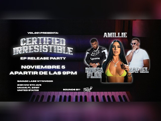 CERTIFIED IRRESISTIBLE – EP RELEASE PARTY by VOL.001 🎤 Showcase en vivo de Amillie 💥 Invitados Especiales: Bodega Flee & Zafiel 🎧 Música por DJ Flacko 📍 Savage Labs Wynwood – Miami, FL 📅 Miercoles 5 de Noviembre | 9PM – 1AM Vol.001 presenta una noche exclusiva en Wynwood para celebrar el lanzamiento del EP “CERTIFIED IRRESISTIBLE” de Amillie — un proyecto que revela su lado más Trap, más Romántico y más Perreo, todo con la actitud que la define como La Irresistible. 🔥 Lo que te espera: * Escucha exclusiva y presentación en vivo antes del estreno mundial a medianoche * Invitados especiales Bodega Flee & Zafiel en el escenario * DJ Flacko encendiendo la noche con Trap Latino, Reggaetón y sonidos callejeros * Un punto de encuentro para la escena latina independiente, fans y creativos 👉 Haz RSVP ahora y asegura tu entrada antes de que se llene.
