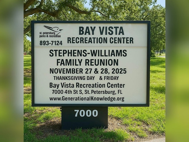 Welcome to the Stephens - Williams 2025 Family Reunion! Join us for a day filled with laughter, memories, and good company at 7000 4th St S. This in-person event is the perfect opportunity to reconnect with relatives, meet new family members, and celebrate our shared heritage. Don't forget to bring your favorite dish for the potluck and a lawn chair for some outdoor fun. Let's make this reunion one to remember! We can't wait to see you there!