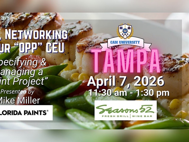 Join us for a fabulous lunch and hear from Mike Miller of Florida Paints, as he presents a 1-hour 'OPP' CEU called "Specifying & Managing a Paint Project." Network with colleagues, socialize, get a CEU credit, and enjoy an amazing lunch! 11:30 am - 1:30 pm
