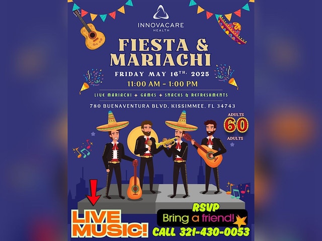 Do you love live music? You won't want to miss this! Join us on May 16 from 11 - 1pm for LIVE MARIACHI. In addition, we'll have games, snack and refreshments. Come join us for fun and music while getting to know InnovaCare Health and other seniors.
