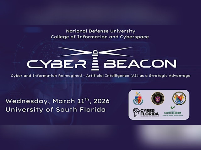 Cyber Beacon 2026 — The National Defense University’s Flagship Cyber Strategy Conference Cyber Beacon is the premier annual conference of the College of Information and Cyberspace (CIC) at the National Defense University, convening senior leaders and bold thinkers from across government, military, academia, and industry to tackle the strategic challenges of the digital age. For more than a decade, Cyber Beacon has shaped high-level dialogue in cyberspace, information warfare, and emerging technologies—cultivating leaders with the strategic foresight to navigate a rapidly evolving threat landscape. In 2026, Cyber Beacon goes on the road. For the first time in its 12-year history, the conference will be held outside the nation’s capital, hosted in partnership with the University of South Florida (USF), its Global and National Security Institute (GNSI), and Cyber Florida in Tampa—a rising hub for AI, cybersecurity, and defense innovation. 2026 Theme: Cyber and Information Reimagined: Artificial Intelligence as a Strategic Advantage This year’s program will explore how AI is transforming the cyber and information domains, with sessions examining: * Cyber and space convergence * DoD–industry collaboration in emerging tech * Countering influence operations and disinformation * Autonomous defense systems * The evolving digital financial landscape Speaker lineup coming soon. The event will feature a diverse mix of voices from DoD, allied nations, federal agencies, industry, and academia—driving conversations that shape national and global security.