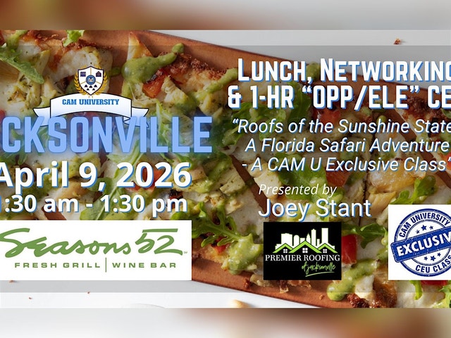 Join us for a fabulous lunch and hear from Joey Stant of Premier Roofing as he presents a 1-hour 'OPP/ELE' CEU on "Roofs of the Sunshine State- A Florida Safari Adventure - A CAMU Exclusive Class." Get your CEU, network with great business partners, and have a fantastic lunch! 11:30 am - 1:30 pm