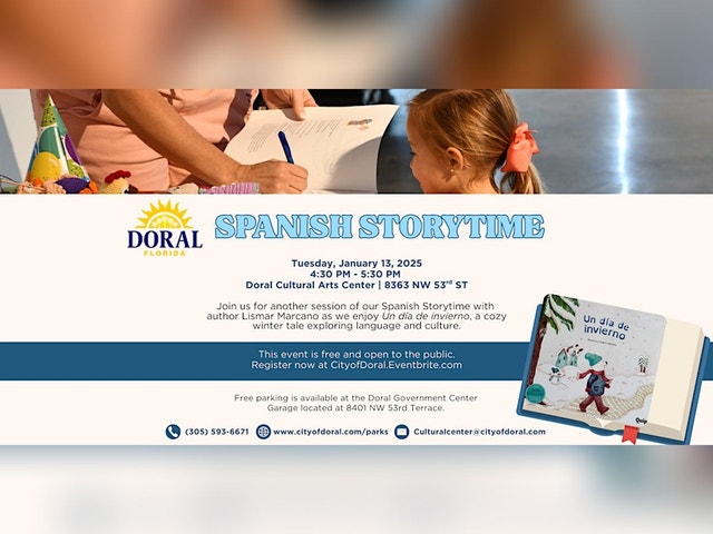 Welcome to our Spanish Storytime! Come and enjoy a cozy and engaging afternoon at the Doral Cultural Arts Center. Join us for another session of our Spanish Storytime with author Lismar Marcano as we enjoy Un día de invierno, a warm winter tale that explores language and culture. Don’t miss this special storytime experience at the Cultural Arts Center! We’ll be expecting you on Tuesday, January 13, 2025, from 4:30 PM to 5:30 PM. This event is free and open to the public. Registration is available at CityofDoral.Eventbrite.com. Free parking is available at the Doral Government Center Garage, located at 8401 NW 53rd Terrace, Doral, FL 33166. For more information, visit www.cityofdoral.com/parks [http://www.cityofdoral.com/parks] or call (305) 593-6671. ¡Bienvenidos a nuestro Cuentacuentos en Español! Ven y disfruta de una acogedora y entretenida tarde en el Doral Cultural Arts Center. Acompáñanos en otra sesión de nuestra Hora de Cuentos en Español con la autora Lismar Marcano, mientras disfrutamos de Un día de invierno, un cuento invernal que explora el lenguaje y la cultura. ¡No te pierdas esta hermosa experiencia en el Centro Cultural! Te esperamos el martes 13 de enero de 2025, de 4:30 p.m. a 5:30 p.m.. Este evento es gratuito y abierto al público. Regístrate en CityofDoral.Eventbrite.com. Estacionamiento gratuito disponible en el Doral Government Center Garage, ubicado en 8401 NW 53rd Terrace, Doral, FL 33166. Para más información, visita www.cityofdoral.com/parks [http://www.cityofdoral.com/parks] o llama al (305) 593-6671.