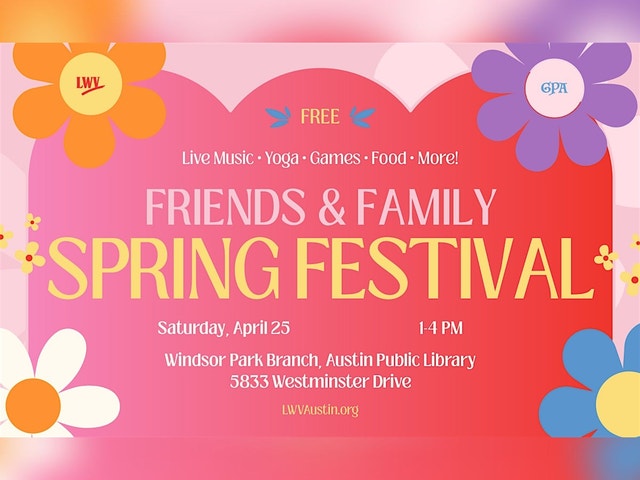 Live music * Suzanna Choffel [https://suzannachoffel.com/] * Lou Priest Trio [https://www.instagram.com/loupriestmusic/?igsh=MWlwNXpleDNmMHRhMQ%3D%3D&utm_source=qr#] Spoken Word Performance by Austin Poet Laureate Zell Miller III [https://library.austintexas.gov/poet] Production by Girls Performance & Advocacy [https://www.gpafindyourvoice.com/] All-ages yoga with Jamie Adair [https://www.jamieadairyoga.com/] Instant personalized poems from Typewriter Rodeo [https://www.typewriterrodeo.com/] Frozen desserts from Kona Ice [https://www.kona-ice.com/] Giant lawn games Scavenger Hunt Much more!