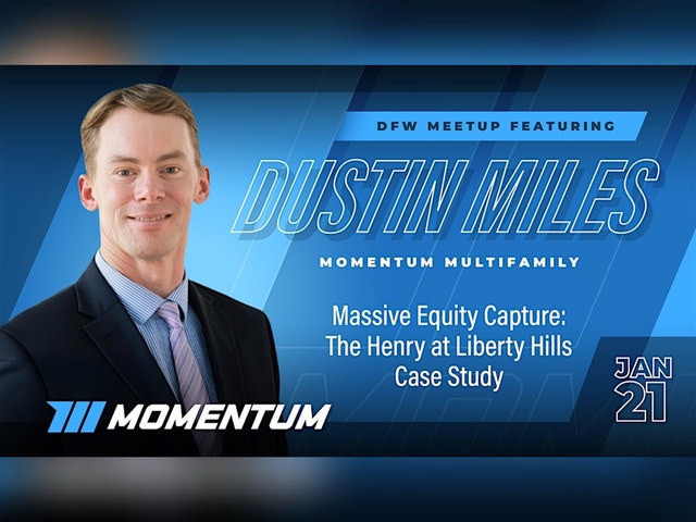 MASSIVE EQUITY CAPTURE: THE HENRY AT LIBERTY HILLS CASE STUDY Join us Wednesday, January 21, 2026 from 6–9 PM for a live case study with Dustin Miles breaking down the full story behind The Henry at Liberty Hills—a deal that achieved massive equity capture through one of the most challenging market cycles in recent years. Purchased during COVID and closed in January 2021, the property delivered strong early cash flow but later faced rising interest rates tied to a Freddie Mac loan. As the market shifted, distributions were paused and strategic decisions were made to protect long-term value. The result: a successful refinance, the cash-out of the preferred equity partner, and distributions restarted at a higher level. Today, the property is cash flowing well and positioned for continued stability. Dustin will cover: * Why the deal was acquired during COVID * Navigating agency debt and rate increases * Pausing and restarting distributions * How the refinance unlocked equity * Key lessons from managing through volatility If you want a transparent look at how equity is built—and preserved—when markets get tough, this is a case study you won’t want to miss.