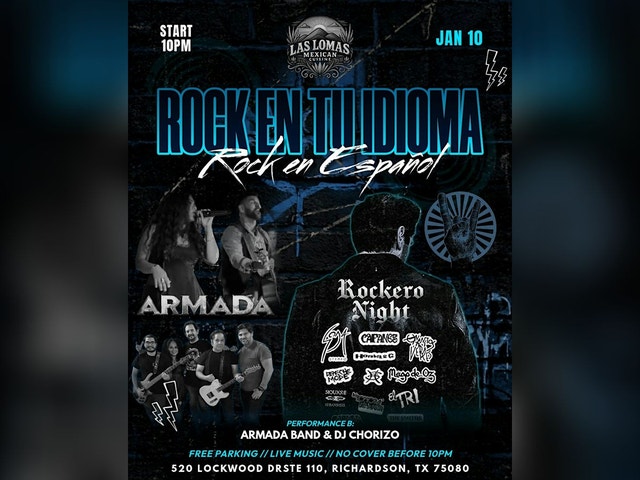 🎸 ROCK EN ESPAÑOL OCHENTERO – EN VIVO 🎸🔥 Sabado 10 de Enero | Rock en tu Idioma Lo mejor de rock en español! Enero se prende con guitarras, nostalgia y actitud. Este sabado 10 de enero, revivimos la época dorada del Rock en Español de los 80s y 90s, con una noche hecha para cantar a todo pulmón, brincar sin pensar y volver a sentir esos himnos que nunca se fueron. 🎸 EN VIVO ARMADA BAND Una de las bandas locales más fuertes, directo al escenario con los clásicos que marcaron historia: Caifanes, Soda Stereo, Héroes del Silencio, Maná, Enanitos Verdes, Jaguares y más. Rock que se te queda en la cabeza, en el corazón y en la voz hasta el final de la noche. 🤘🔥 📍 Las Lomas Mexican Cuisine 📌 520 Lockwood Dr Suite 100, Richardson, TX 75080 🍽️ Llega temprano a cenar 🎶 Quédate para el rock en vivo 🔥 Cuando empieza la música, el lugar se transforma en una verdadera fiesta rockera! 🍹🔥 BEBIDAS, COMIDA Y NOSTALGIA Cocteles artesanales, cervezas bien frías y una vibra que mezcla recuerdos, energía y puro rock latino. Aquí no vienes a mirar — vienes a cantar, bailar y revivir. ⏰ Música en vivo: 10PM 🔥 LO QUE TE ESPERA 🎸 Rock en Español ochentero y noventero en vivo 💃 Pista encendida toda la noche 🎶 Himnos clásicos que todos saben cantar 🍹 Cocteles y bebidas especiales 🍽️ Cocina abierta con menú completo 🔥 Ambiente real de rock — sin poses, sin filtros 🎤 Esta noche es para: ✔️ Amantes del rock en español clásico ✔️ Fans de los 80s y 90s ✔️ Quienes crecieron con estos himnos ✔️ Quienes quieren sentir esa energía otra vez 🔥 SABADO10 DE ENERO Saca tu mejor look rocker. Arma el plan con tu crew. Llena tu cabeza de rock… y deja que la música haga el resto. 🎸🔥ROCK EN ESPAÑOL OCHENTERO EN VIVO con ALEBRIJE BAND 🔥🎸No es solo una noche — es un viaje a la era dorada del rock latino