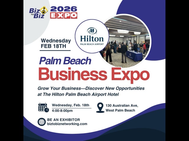 WERE BACK FOR THE PALM BEACH BUSINESS EXPO 2026 WEDNESDAY, FEBRUARY 18TH 2026 from 4:00pm – 8:00pm FREE ADMISSION FOR GUESTS - WIN OVER $5,000 IN DOOR PRIZES Hilton Palm Beach Airport 130 Australian Ave, West Palm Beach, FL 33406 I-95 & Southern Blvd. | Majestic Ballroom Over 10,000 sq.ft. of exhibitor space Join us to discover all types of companies showcasing their products and services. From A-Z there's something for everyone Palm Beach Palm Beach Business Expo Bringing Together Businesses from Dade, Broward and Palm Beaches Sign Up Your Business Today: www.biztobiznetworking.com 6ft Sponsor Table – $250.00 8ft Sponsor Table – $350.00 10x 10 Space – $575.00 10 x 20 Space – $975.00 Triple Value Packages- 6FT $650 | 8FT $950 VALUE PACKAGE INFO FREE ADMISSION TO ATTEND - COME ON BY FOR FREE - FREE TICKETS Everyone is Welcome to Attend - Plenty of Parking Exhibitor tables are skirted and include two chairs and a small sign Multi Level Marketing Companies- Please Call Before Signing Up- 954-838-9644 Why Should You Exhibit At Expo? Biz To Biz Business Expos is your one opportunity to bring your business face to face with hundreds of executives. FREE ADMISSION FOR THE PUBLIC Exhibitors are welcome to display their promotional materials, giveaways, drawings, samples Solicitation from the public is strictly prohibited to business cards only. No other hand outs or any other materials are authorize DON’T MISS THIS GREAT OPPORTUNITY TO SHOWCASE YOUR BUSINESS- Call 954.838.9644 or Sign Up www.biztobiznetworking.com