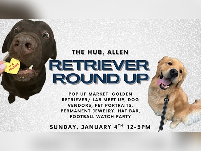 Retriever Round Up at The HUB – Allen Sunday, January 4 • 12–5 PM Calling all dog lovers — especially our Golden Retriever and Labrador families! 🐾 Join us at The HUB in Allen for the ultimate Retriever Round Up, a fun-filled pop-up market and meetup celebrating our favorite furry friends. Bring your pups and enjoy: • 🐕 Golden Retriever & Lab Meet-Up • 🛍️ Dog + Local Vendors • 🎨 Pet Portraits • ✨ Permanent Jewelry • 🤠 Hat Bar • 🏈 Football Watch Party on the Big Screen It’s the perfect Sunday outing for dogs, dog people, and anyone who loves a lively community hangout. Grab your pup, your friends, and your game-day spirit — we’ll see you at The HUB! Address: 1289 Johnson Rd. Allen, TX