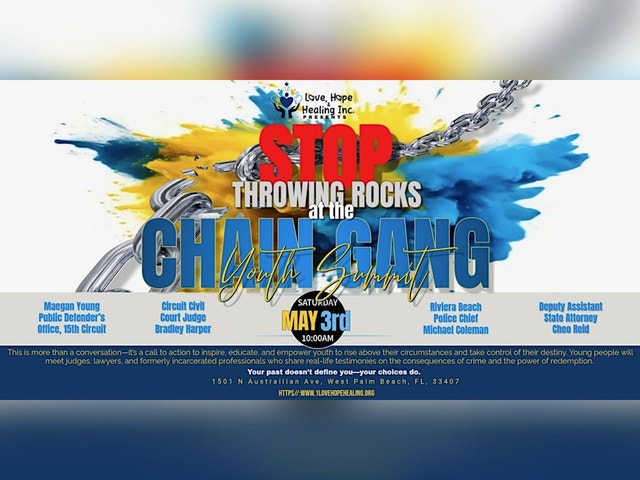 Welcome to the "Stop Throwing Rocks at the Chain Gang" Youth Summit! This vital event aims to prevent youth crime by educating, inspiring, and empowering young people in our community. The phrase "Stop Throwing Rocks at The Chain Gang" comes from the Black community, with "rocks" symbolizing crimes and "chain gang" symbolizing prison. We aim to steer our youth away from choices that lead to incarceration. For Youth ages 13-22 years of age. Why This Summit Matters: Our community faces the critical challenge of youth involvement in crime, leading to devastating consequences. This summit provides a proactive solution by: * Educating: Providing firsthand knowledge about the legal system and the consequences of criminal behavior through expert panel discussions featuring the Police Chief of Riviera Beach Micheal Coleman, Deputy Assistant State Attorney Cheo Reid, Chief of the Juvenile Division in Palm Beach County, Judge Bradley Harper, and an Attorney Maegan Young from the Public Defender's Office. * Inspiring: Sharing powerful stories of redemption from formerly incarcerated individuals who have transformed their lives, including our Co-founder and Executive Director, Donte Bates. * Empowering: Equipping youth with essential skills in mental health awareness, conflict resolution, and violence prevention through interactive breakout sessions. * Connecting: Fostering positive relationships between youth, law enforcement, and community leaders. Event Highlights: * Expert Panel Discussions: Legal & Redemption Perspectives * Interactive Breakout Sessions: Mental Health, Conflict Resolution, Teen Violence * Community Engagement: Games, Music, Food, and Networking The Meaning Behind "Stop Throwing Rocks at The Chain Gang": This powerful metaphor, rooted in the Black community, symbolizes the choice young people face. "Rocks" represent criminal acts, and the "Chain Gang" represents the devastating consequences of incarceration. We aim to guide youth away from "throwing rocks" and towards a brighter future.
