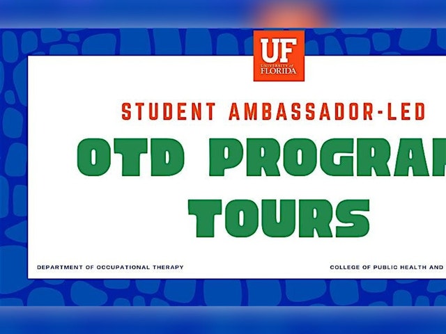 Join an in-person tour of the University of Florida's Department of Occupational Therapy, led by current student leaders, OTD Ambassadors. Ask questions, check out our facilities, and learn about the entry-level Occupational Therapy Doctorate program’s application and admission process. OTD Ambassadors will share their experiences and build your excitement for all things occupational therapy! Family and friends are welcome to register and attend with you as well. Additional location information and parking details will shared upon registration. Contact Information Email: OTAdmissions@phhp.ufl.edu [OTAdmissions@phhp.ufl.edu] Phone: (352) 273-6817