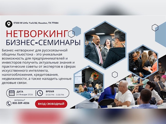 💼 К нам едет представитель налоговой службы (IRS)! 💼 Бизнес-форум для русскоязычной общины Хьюстона — открытое мероприятие для всех, а не только для владельцев бизнеса. Вас ждут полезные знания, живые обсуждения и дружеская атмосфера. 🎤 Спикеры форума: • Марк Уинчестер (SBA) — госконтракты, сертификация и возможности для малого бизнеса. • Gonzalez, Sheba (IRS) — налоговые стратегии. • Lena Pearlman — кредитование и банковские программы. • Elena Jackson — рынок недвижимости и инвестиции. • Asheshon Goncharov — технологии и искусственный интеллект. • Elena Wilske — стратегия, коммуникации и развитие бизнеса. • Ian Goldshtein — иммиграционное право для предпринимателей. 💬 Круглые столы со специалистами: Личное общение со спикерами, индивидуальные рекомендации и ответы на вопросы. 🎁 Что ждёт гостей: • Бесплатные консультации от экспертов • Купоны и скидки от бизнесов • Розыгрыш призов • Полезный нетворкинг 🍰 Будут угощения для всех гостей. 🧸 Работает детская комната, чтобы родители могли спокойно участвовать в форуме. 🎙 Для владельцев бизнеса: • Можно принести свои купоны/сертификаты • Возможность сделать 30-секундную elevator speech (необходимо согласовать заранее с Еленой Джексон) 📋 Регистрация обязательна, количество мест ограничено.
