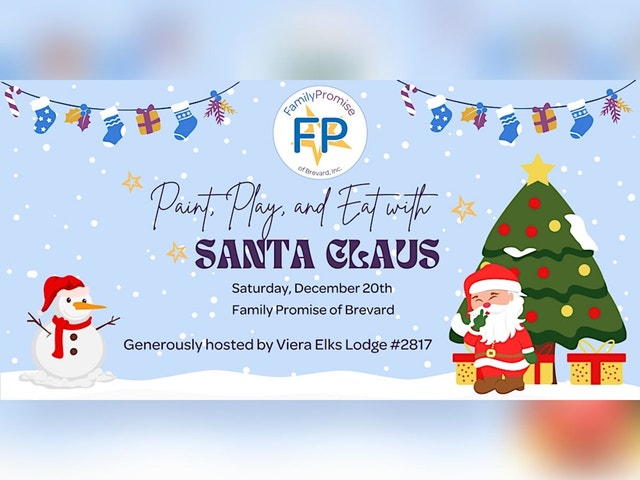 Generously hosted by Viera Elks Lodge #2817 First-come, first-served, while supplies last! Playground will be open! **If you plan to paint, wear/bring clothes you don't mind getting messy** DATE: Saturday, December 20 TIME: 11am-1pm Stop in between 11a-1p, stay as long as you'd like! LOCATION: Family Promise of Brevard 114 1st Street Cocoa (behind the Cocoa water tower)