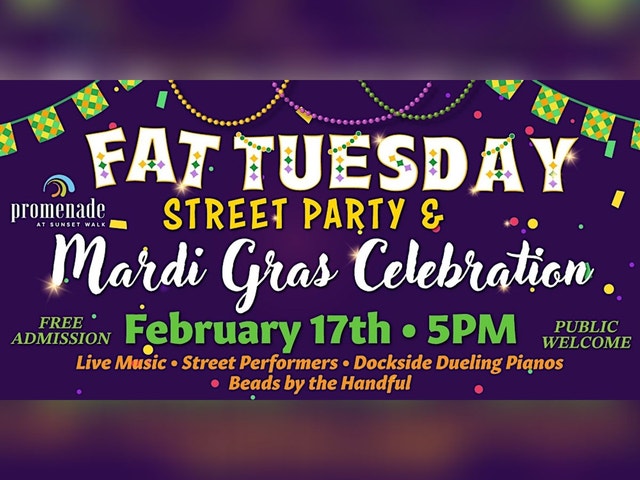 TUESDAY, FEBRUARY 17TH BEGINNING AT 5PM JOIN THE PROMENADE AT SUNSET WALK FOR THE 4TH ANNUAL FAT TUESDAY STREET PARTY & MARDI GRAS CELEBRATION Prepare to Celebrate Mardi Gras like never before. We've got everything you need for your Fat Tuesday experience. Gather your friends, and Join Us at the Promenade - Sunset Walk for a night of Non-Stop Live Music & Fun... as we "Let the Good Times Roll" - "Laissez les bons temps rouler"!! * "The "Mardi McFlys" Live in Concert * D J K1X * "Dockside Dueling Pianos" at The Wharf * Beads by the Handful * Mardi Gras Street Performers * Craft Vendors * The Mardi Gras Express - Train Rides * Food & Beverage Specials and More! FREE ADMISSION & FREE PARKING / PUBLIC WELCOME Over 30 Restaurants, Specialty Shops, and Experiences Rain or Shine No Outside Food or Beverage Permitted NOTICE: ONLY RSVPs or TICKETS PURCHASED THROUGH THE EVENTBRITE PLATFORM WILL BE HONORED. THERE ARE NO AUTHORIZED THIRD PARTY TICKETING PLATFORMS. Show less
